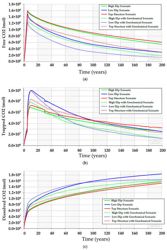 Comparison between the CO2 amounts in the high-dip, low-dip, and top structure scenarios with and without modeling the geochemical reactions. (a) Free CO2; (b) Trapped CO2; (c) Dissolved CO2.