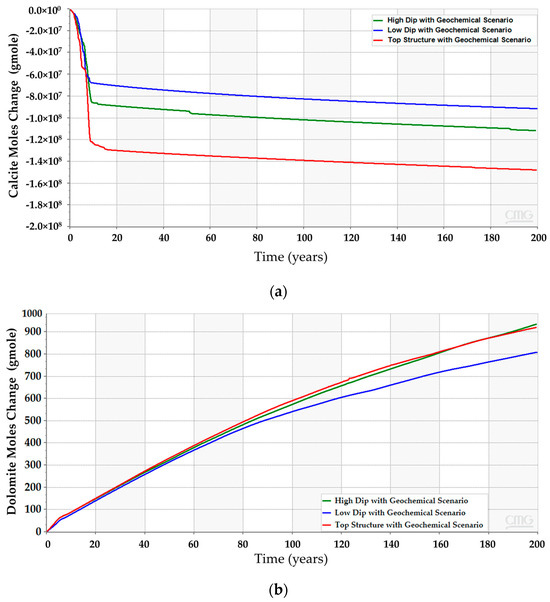 After incorporating the geochemical reactions into the simulation model for the three scenarios, the analyses suggest that all of them should obey a similar trend (see Figure 12). Even though the geochemical reactions reduce the gap between the scenarios, the difference in the CO2 amounts resulted from the different reactions with the reservoir rock minerals. The anticipated interactions between the injected CO2 and the subsurface minerals yield calcite dissolution and dolomite precipitation, as demonstrated in Figure 13. The low-dip scenario yields the lowest calcite dissolution and dolomite precipitation. Moreover, the free CO2 has the most significant reduction in the top structure scenario since more calcite dissolution occurs. It is noteworthy that the majority of these processes require a relatively long-time post-injection for all scenarios. Thus, the low-dip region would be preferable to start the CO2 sequestration development, even when including the geochemical interactions.