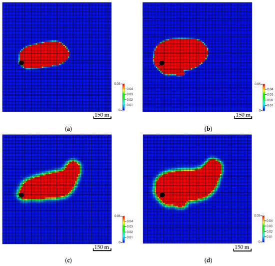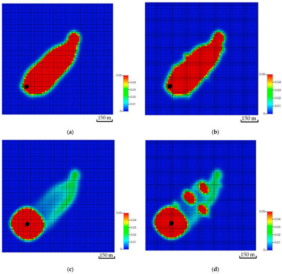 Effect of tortuosity on CO2 global mole fraction distribution. (a) The base scenario after the injection stops; (b) The tortuosity scenario after the injection stops; (c) The base scenario after 200 years of simulation; (d) The tortuosity scenario after 200 years of simulation.