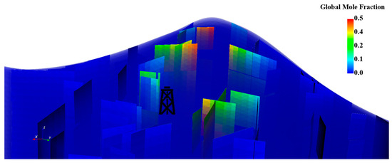 The three fracture network realizations aid in analyzing the fracture roles across different layers. The generated scenarios reflect the trapping mechanisms within the fractures throughout the storage process. The natural fractures around the wellbore region provide significantly faster corridors to transport the CO2 from the bottom to the top of the aquifer. However, the free CO2 has the potential to dissolve across the fracture path either laterally or vertically when it encounters fractures away from the wellbore. Figure 16 illustrates the global mole fraction in the fractures throughout the migration path. Additionally, the fractures have a noticeable impact in the earlier stages but a negligible impact on the plume shape in the long term, as demonstrated in Figure 17.