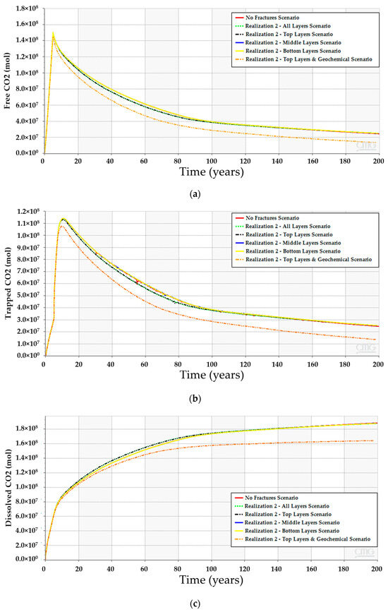 CO2 quantities when incorporating fractures in the simulation model. (a) Free CO2; (b) Trapped CO2; (c) Dissolved CO2.