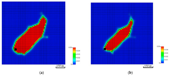 Top view of the CO2 global mole fraction for the second fracture network realization. (a) The CO2 plume excluding the geochemical reactions; (b) The CO2 plume with the geochemical reactions.