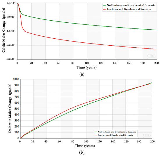 Chemical reactions outcome due to CO2 and minerals interactions when incorporating natural fractures in the simulation model. (a) Calcite dissolution; (b) Dolomite precipitation.