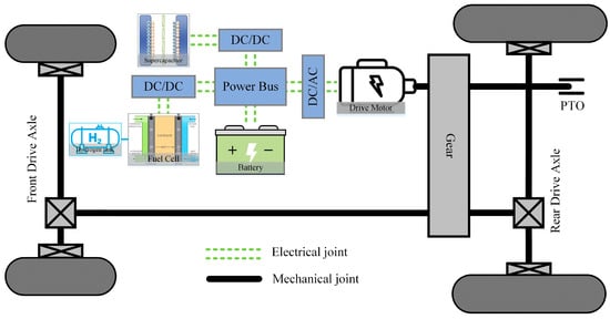 This study investigates a FCHET featuring a multi-energy source fusion system. As illustrated in Figure 1, the system integrates fuel cells, batteries, and supercapacitors. Leveraging the distinct characteristics of each energy source, the battery is directly connected to the power bus, establishing its voltage as the bus voltage. The fuel cell is connected to the power bus via a series unidirectional DC/DC converter. The supercapacitor is connected to the bus via a series bidirectional DC/DC converter. The drive motor, serving as the tractor’s primary power source, transforms electrical energy from the various energy sources into mechanical energy. This mechanical energy is then delivered to the four wheels and power take-off (PTO) shaft via the mechanical transmission system.