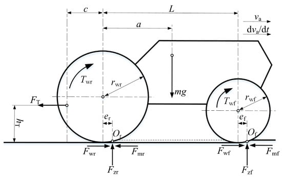 where Bn is the tire traction index; i represents front wheels when it is f and rear wheels when it is r; CI is the tire–soil cone index; b is the unloaded tire section width, m; d is the unloaded tire diameter, m; dc is the tire radial deformation, m; h is the tire section height, m; Fz is the tire normal load, N; GTR is the tire traction utilization coefficient; Fw is the tire traction force, N; S is the tire slip ratio; MMR is the tire rolling resistance coefficient; and Fm is the tire motion resistance, N.