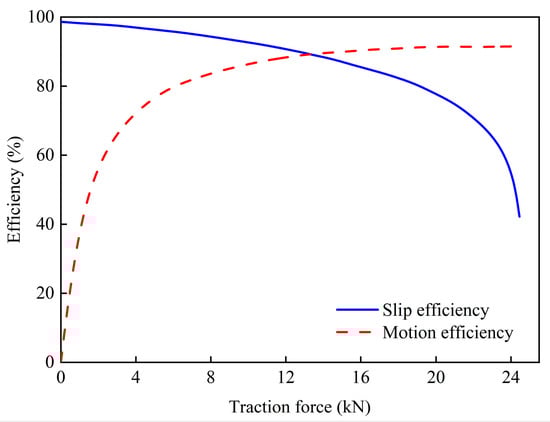 The relationship between the slip efficiency, motion efficiency, and traction force of a four-wheel drive tractor is shown in Figure 3, obtained using the traction performance prediction method for four-wheel drive tractors.