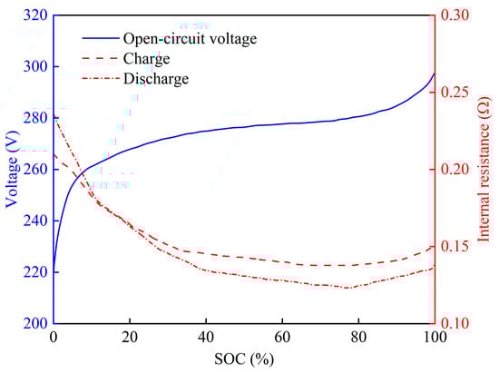 The battery functions as a buffer energy source, enhancing the efficiency of the fuel cell system [48]. It is modeled as an open-circuit voltage source in series with an internal resistance [37]. The relationship between the battery’s internal resistance, open-circuit voltage, and SOC is shown in Figure 5. The battery’s output characteristics are described by the following equation: