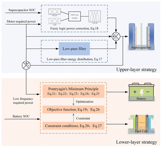 This section proposes a HIO EMS based on low-pass filtering and minimizing equivalent energy consumption, as shown in Figure 6. The proposed strategy consists of two layers: upper and lower. In the upper-layer strategy, by considering the high-power density of supercapacitors, a power allocation method based on a low-pass filter is proposed to provide dynamic power. A fuzzy logic is set up to ensure that the supercapacitor SOC remains within a reasonable range. In the lower-layer strategy, an equivalent energy consumption minimization strategy is considered in order for the fuel cell and battery to meet the remaining power demand of the vehicle while achieving optimal instantaneous power allocation for the battery and fuel cell, thereby improving the system economy.