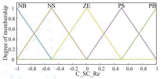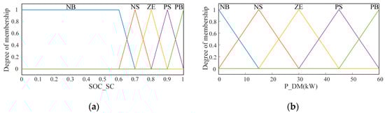 As shown in Figure 6, the inputs to this fuzzy control are the current supercapacitor SOC (SOC_SC) and the driving motor’s required output power (P_DM). The supercapacitor correction coefficient (C_SC_Re) changes from a constant value to a real-time variable output of the fuzzy control. The input and output membership functions are determined. The input membership function for supercapacitor SOC, the input membership function for driving motor power demand, and the output membership function for the correction coefficient are shown in Figure 7 and Figure 8.