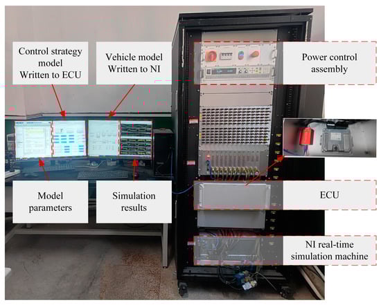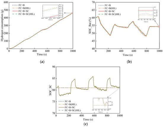 The experimental results were compared with the simulation outcomes. As shown in Figure 14, the HIL experiments revealed very close agreement between the simulated data and the actual measurements regarding the hydrogen consumption of the fuel cell, as well as the SOC of both the battery and supercapacitor. Under the equivalent fuel consumption strategy, both configurations displayed similar trends in fuel cell hydrogen consumption and battery SOC variations. Importantly, compared to the FC+B configuration, the addition of a supercapacitor did not increase hydrogen consumption. On the contrary, as indicated by the data in Table 4, the battery’s SOC improved while hydrogen consumption decreased. In summary, both the simulation and HIL experimental results support the effectiveness of the proposed control strategy.