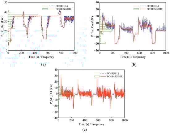 Power output profiles for different control strategies. (a) Fuel cell; (b) battery; and (c) supercapacitor.