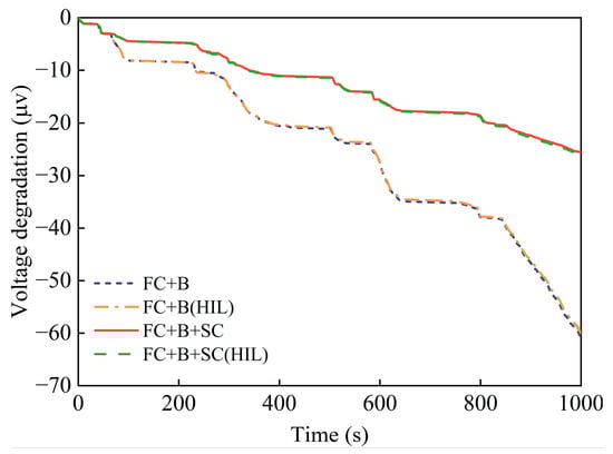 Figure 15 presents a comparative analysis of voltage degradation in two different configurations of fuel cell systems. The results indicate that the FC+B+SC configuration significantly reduces cumulative voltage degradation compared to the FC+B configuration. This evidence strongly supports the effectiveness of the FC+B+SC configuration in mitigating the performance decline in fuel cells. Therefore, the addition of a supercapacitor under fuzzy logic low-pass filter control effectively improves the operating conditions of the battery and fuel cell, thereby extending their lifespan. Furthermore, the results from the HIL experiments were in very close agreement with the simulation outcomes.