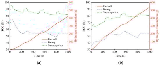 Figure 14 shows the energy consumption of each energy source under the instantaneous optimization strategy for both configurations. To minimize the influence of the supercapacitor SOC on the comparative analysis, the initial battery SOC is set to 60% and the initial supercapacitor SOC is set to 81%. Since the FC+B configuration does not have a supercapacitor, a straight line with the same initial value is used as a reference for comparison in the figure.