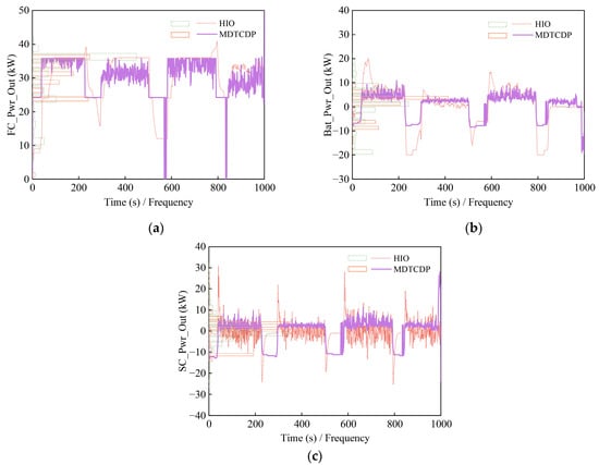 To investigate the energy consumption potential of the global optimal control strategy for FCHET and evaluate the proposed HIO-based EMS, this section compares the EMS based on MDDP-FSC with the proposed EMS. To obtain the global optimal cost as a reference for the control strategy in this paper, the power rate of change in the power sources is not constrained. Figure 17 shows the power output of each energy source under the two control strategies.