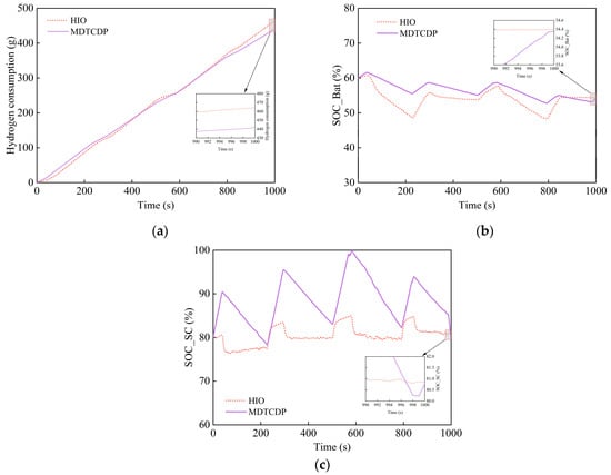 Energy consumption curves for different control strategies. (a) Hydrogen consumption; (b) battery SOC; and (c) supercapacitor SOC.