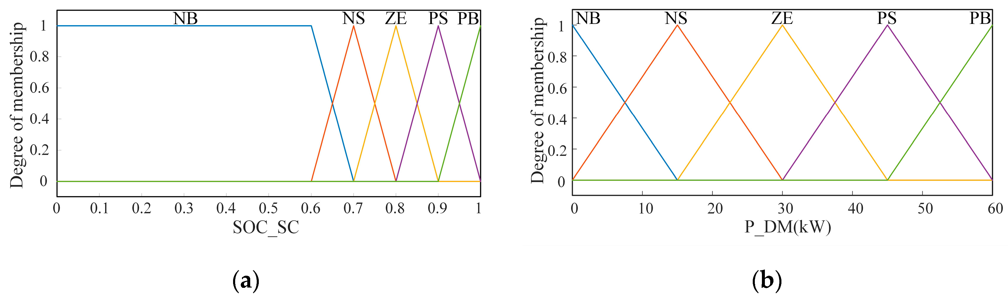 Input membership function. (a) Supercapacitor SOC; (b) drive motor power demand.