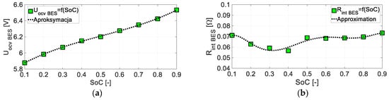 Figure 9 shows graphs of the identified parameters of the battery: (a) UOCV BES = f(SoC), (b) Rint BES = f(SoC), (c) R1 BES = f(SoC), (d) R2 BES = f(SoC), (e) C1 BES = f(SoC) and (f) C2 BES = f(SoC).