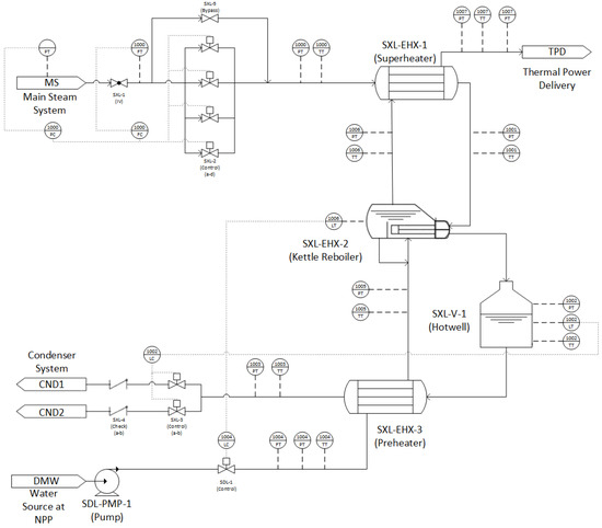 The TPD system design for the 500 MWe hydrogen facility is located outside of the turbine building and inside of the protected area of the nuclear power plant. The TPD system connects to the existing secondary system of the NPP at the cross under the pipe of the high-pressure turbine. Two connections draw steam downstream of the high-pressure turbine, one for each cross under the pipe, each containing valves to provide two valve isolation locations prior to merging into a common extraction pipe. This common pipe exits the turbine building to a protected area, where the flow splits into two pipes supplying two identical trains of the TPD system. Each train has a set of double isolation valves to permit single-train operation if necessary. A flow control valve that controls the steam flow for normal system operation is located downstream from the isolation valves and upstream from the kettle reboiler. A flow transmitter is downstream of the control valve and controls the position of the flow control valve via a proportional–integral (PI) controller. The kettle reboiler is a shell and tube heat exchanger designed to fully condense the steam extracted from the secondary system prior to flowing to the drain receiver. This condensed steam then flows to a drain receiver designed to maintain a separation between liquid and vapor phases and prevent steam flow to the main condenser. This is done with a level transmitter connected to a level control valve downstream of the drain cooler. This valve is controlled by a PI controller modulating flow to maintain the drain receiver level in the desired range. Downstream of the drain receiver is a plate and frame-type heat exchanger called the drain cooler. This subcools the liquid prior to the return line connected to the main condenser.