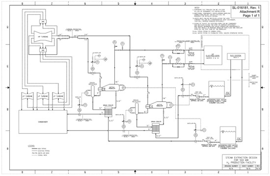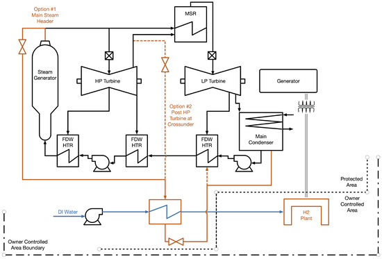 This work focuses on using the TPD system as the thermal power source for high-temperature steam electrolysis (HTSE) co-located with the power plant. This process uses mainly electrical power in large amounts to split superheated steam into hydrogen gas and oxygen gas. Thermal power is used to perform the process of fluid preheating and steam vaporization steps in the HTSE plant [2]. The design of the HTSE plant that is coupled with the TPD and the NPP uses several other unit operations that perform preheating and heat recovery steps as well as the chemical separation processes to isolate the hydrogen gas produced [3]. The heat recuperation, combined with a small amount of electrical topping heat, allows the low-temperature thermal power source from a typical LWR (about 300 °C) to remain economically competitive for hydrogen production [4]. There are alternative methods for generating hydrogen using the heat generated by an NPP. These processes are mainly thermal processes, with a small amount of electricity required. One example of this is the sulfur–iodine process, which involves the formation and decomposition of sulfuric acid (H2SO4) and hydroiodic acid (HI) from various gases, including sulfur dioxide (SO2), iodine (I2), and water. The high-temperature acids decompose at temperatures as high as 850 °C, which allows for the generation and separation of hydrogen and oxygen gases [5]. Typical nuclear power applications for these thermochemical alternatives for hydrogen production include several generation IV reactor designs, such as the very-high-temperature reactor (VHTR) or the high-temperature gas reactor (HTGR), as these can achieve reactor coolant temperatures near the required temperatures to maintain these high-temperature endothermic chemical reactions [6]. HTSE is an appropriate application for exiting LWRs due to the lower reactor coolant temperature available for thermal power dispatch. Additionally, the low amount of thermal power required by a large HTSE plant has a significantly smaller effect on the operation of the existing plant systems.