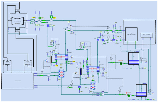 The design was further refined by the Architecture and Engineering Firm Sargent & Lundy (S&L) (Chicago, IL, USA), under contract by the Idaho National Laboratory to develop a pre-conceptual design of the steam-to-steam system configuration. The resulting system design and specification was the basis of the implementation described in this work [14]. The system underwent a name change from the thermal power extraction (TPE) to its current thermal power dispatch (TPD) designation in conjunction with these design changes. The most significant change was the steam extraction location being moved from the main steam to downstream of the high-pressure turbine outlet, prior to the moisture separator reheaters (MSRs) as can be seen in Figure 2. This shift in extraction location provides lower pressure and lower temperature steam to the TPD system than could be achieved by main steam extraction; however, the steam is still sufficient to meet the condition requirements for the HTSE plant, which are defined as steam of at least 148.89 °C (300 °F) and 0.34 MPa (50 psig). Additionally, the impact on the thermodynamics of the turbine-generator system is significantly lessened.