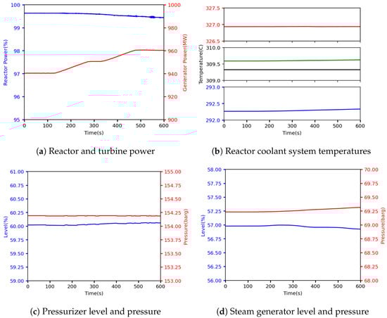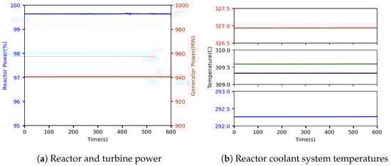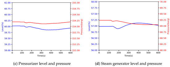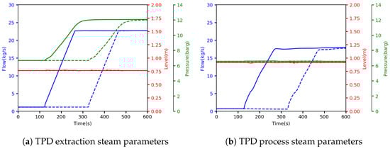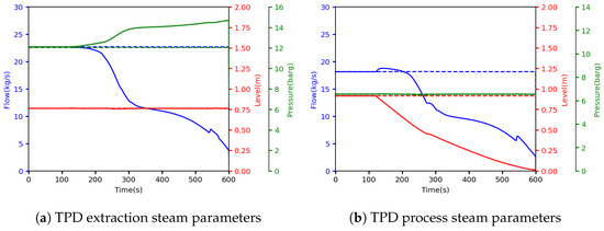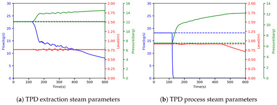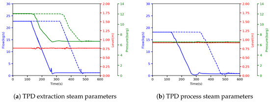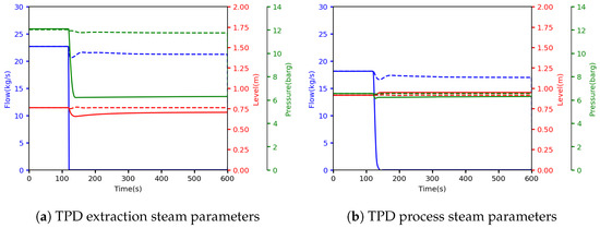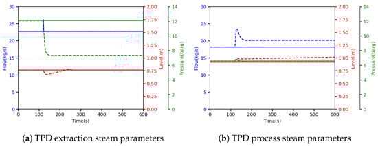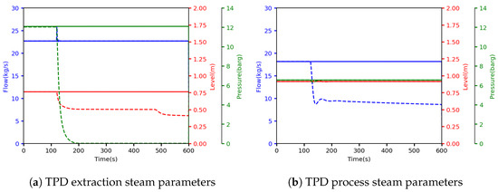 Controllers were utilized in the simulator to maintain the reboiler level, steam extraction flow, and pressure within the TPD system, as described in Section 2.1. In nuclear reactors, there is a mix of PI controllers and proportional–integral–derivative (PID) controllers used. This simulation utilizes PI controllers, for which the characteristic oscillation can be seen in the steam extraction flow rate (blue line) and reboiler level (red line) in Figure 7a. This decision was made since the PI controller was inserted and tuned in a very early iteration of the simulator and met all performance requirements for the project. Although the spike observed as steam flow approaches the setpoint in Figure 7a, this has been verified to not be due to PI controller feedback by observing the valve position. This is further discussed as a limitation in Section 4.4.