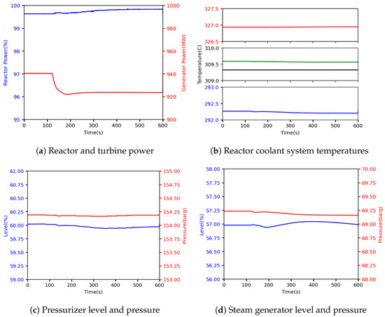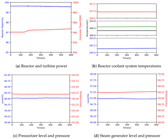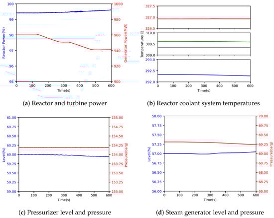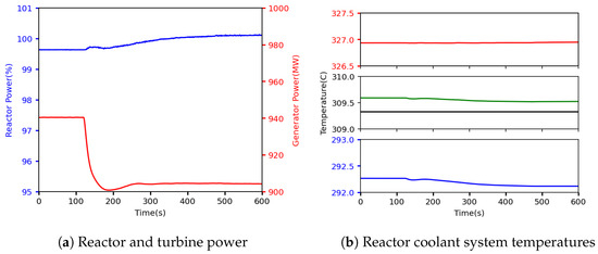 The aforementioned reduction in steam flow to the steam extraction loop results in more steam flow being directed to the low-pressure turbines, leading to the increase in generator power seen in Figure 20a. Reactor power drops slightly due to the minor reduction in overall steam flow, while all other primary parameters visible in Figure 20 remain relatively constant.