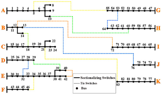 - Peng, C.; Xu, L.; Gong, X.; Sun, H.; Pan, L. Molecular evolution based dynamic reconfiguration of distribution networks with DGs considering three-phase balance and switching times. IEEE Trans. Ind. Inform. 2018, 15, 1866–1876. [Google Scholar] [CrossRef]