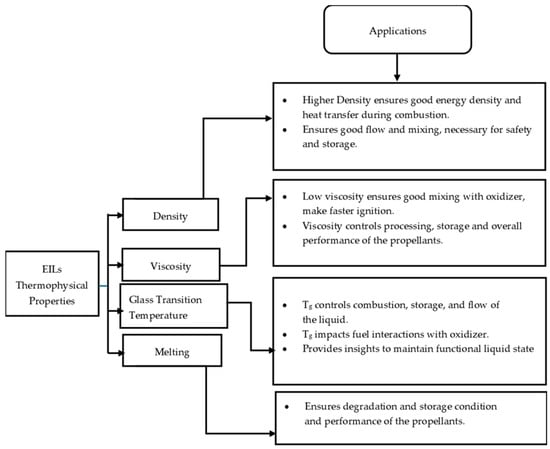 Figure 1 shows the thermophysical properties of EILs and their importance in various applications. Understanding the glass transition temperature (Tg) of EILs ensures stability under operational conditions, helping to prevent vaporization or crystallization in critical applications. Viscosity plays a vital role in enabling smooth flow in propulsion systems, minimizing clogging or pumping issues. These thermophysical properties are crucial as they allow researchers to design EILs tailored to specific applications, influencing their behavior under different conditions and determining their suitability for specific use. The key thermophysical properties of EILs are summarized below.