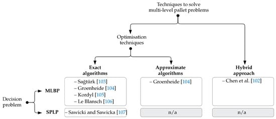 The MLBP is a type of multi-level pallet decision problem that has not been extensively analysed in the literature. Currently, two specific approaches can be identified, including the hybrid approach [] and optimisation techniques, both exact [,,] and approximate []. The associated structure is presented in Figure 1.