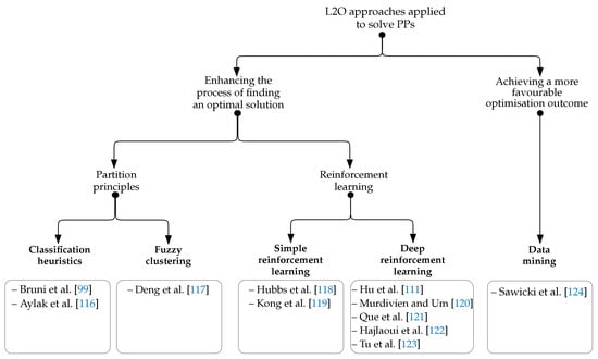 As a supplementary perspective, and based on the literature review excluding the problem analysed by Wu et al. [], this paper identifies two generic areas of L2O application within the PP domain (see Figure 2). Firstly, it intervenes in the computational procedure and the formulation of the mathematical model to enhance the process of finding an optimal solution. Secondly, it supports the analysis and exploration of parameter values to achieve a more favourable optimisation outcome.