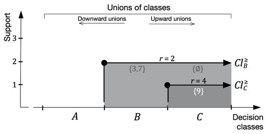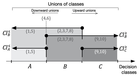Referring to the example in Table 1 (see Section 3.1), three ascending decision classes have been defined: A, B, and C. The application of DRST allows the formation of four unions of classes, namely, at most A: , at most B: , at least B: , and at least C: . Considering the dominance relations defined in Section 3.1 and the unions of classes in this section, it is possible to determine the lower and upper approximations of each union of classes and their boundary regions, as follows: