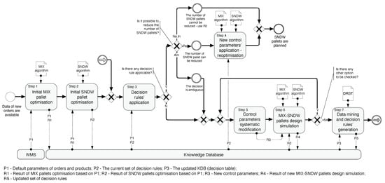 In contrast, the literature contains a few examples of studies devoted to classification by data mining and applied to the PP domain, e.g., Sawicki et al. []. They address a distributor’s multi-pallet loading challenge, introducing the stacking of elementary pallet units to create Sandwich Pallet Loading Units (SNDW). The study optimises both elementary units and SNDW, considering weight and height constraints, using knowledge from previous instances. By applying Dominance-Based Rough Sets Theory (DRST) and rule-based decision-making, rules are established to guide the reduction in SNDW by adjusting control parameters in the elementary pallet design. Experimental simulations, augmented by DRST, validate these decisions and contribute to an updated set of decision rules for future order processing. This systematic approach achieves an effectiveness rate of 83% in classifying new orders for potential improvement within the multi-pallet loading process.