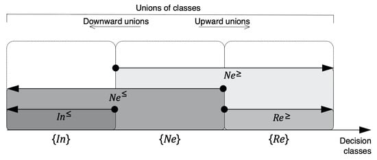 The decision characteristic D, where , constitutes the partition of U into a finite number of categories , with . It is also assumed that each object x belongs to only one category , and all t-classes are ordered according to an increasing importance of preferences. This implies that objects assigned to class are preferred over objects from if . If an object is assigned to class h according to the characteristic D, and its conditional part C outperforms the conditional part of any other object assigned to class g, it generates a certain inconsistency in DRST. For this reason, two categories of union of classes have been introduced, i.e., upward and downward unions of classes [,]. The upward union of classes is the set of objects that belong to class or to classes more preferred than t, and it is expressed as follows: