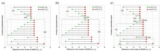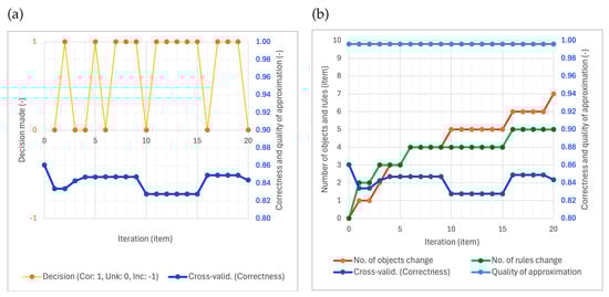 Both consistency measures, i.e., the accuracy of approximation and the quality of sorting , evaluate the extent to which knowledge about objects and their assignment to individual classes generates conflicts. The accuracy of approximation identifies conflicts occurring separately within each decision class, whereas the quality of sorting refers to all decision classes in total. The higher the values of both indicators, where and , the more information about the objects can be considered a source of reliable reasoning. From a practical perspective, both measures form the basis for evaluating the validity of using particular parameters that characterise the objects in the decision table.