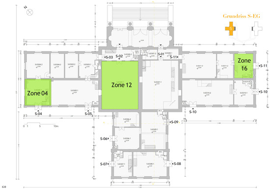 The interior space of the Praterateliers’ southern pavilion is divided during the simulation process into separate zones, to better understand how heat behaves within the building. This zoning method is based on how the DesignBuilder simulation software organizes and labels areas during calculations. It considers factors like wind exposure and the building’s layout. Three zones have been selected (Figure 9). Zone 12 is at the center of the building; zone 04 faces the prevailing wind direction, and zone 16 is sheltered from this wind. Each zone has its own features that affect how it responds to temperature changes, helping us to grasp how heat moves throughout the building.