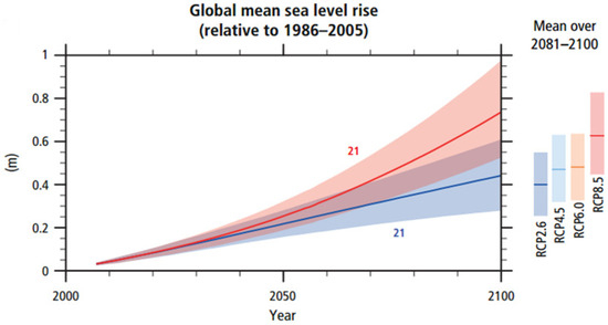 Future global mean surface temperature is estimated by multi-model simulations. All changes are relative to 1985–2005. Time series of projections and a measure of uncertainty (shading) are shown for scenario RCP2.6 (Blue) and RCP8.5 (red). Source IPCC AR5 [49].