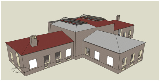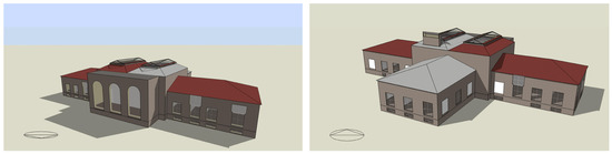 The model of the investigated building, with the southern view (left) and northern view (right)—Scenario 1, shown in the DesignBuilder software.