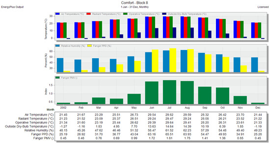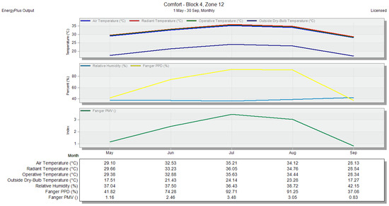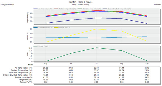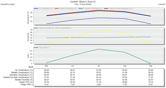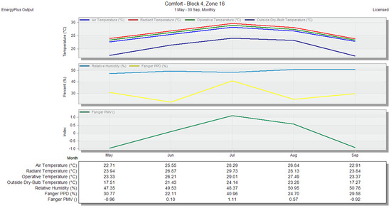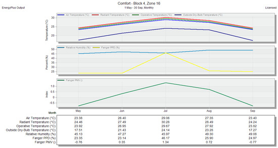 Air temperature and PMV for zone 16—without any natural ventilation methods—monthly period, shown in the DesignBuilder software.