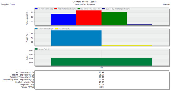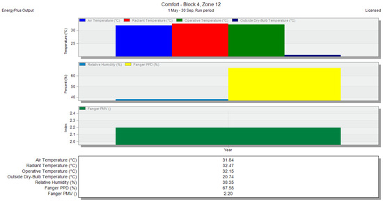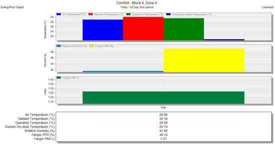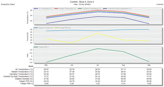 In the thermal analysis results taken from DesignBuilder, graphs like those in Figure 15 display monthly data, with the x-axis representing the months from May to September (the four warmest months of the year), covering the period of 2020–2030. The y-axis represents various temperature and comfort parameters. Temperature values are indicated as follows: blue for air temperature, red for radiant temperature, green for operative temperature, and dark blue for outside dry bulb temperature. Percentage values are represented as blue for relative humidity and yellow for the Fanger PPD value, while the Fanger PMV index is shown in green. Below the graph, a rectangular box provides detailed values for these parameters for the four-month period (May to September) under investigation. The charts, like those in Figure 16, show annual averages for the same parameters over the period of 2020–2030. The x-axis again represents temperature and comfort parameters, with the y-axis showing the average yearly values. The rectangular box beneath this chart provides the yearly average for all thermal comfort measures. This chart description applies to all subsequent scenarios presented in this research.