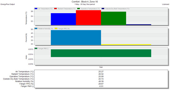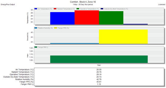 Air temperature and PMV for zone 16—without any natural ventilation methods—run period, shown in the DesignBuilder software.