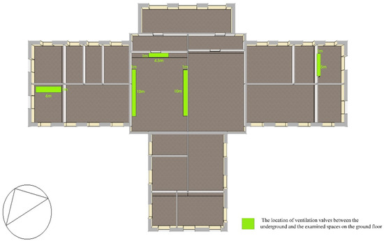 The location of the underground vents in the plan of the building under investigation in Scenario 2.
