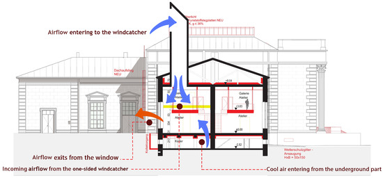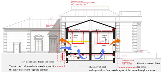 Approaches for enhancing energy efficiency in the historic buildings of the Praterateliers’ Pavilions are also derived from a history of the use of natural ventilation systems in cultural heritage buildings in Vienna, for example, the air well systems of the Burgtheater and the Neue Burg. The question of ventilation and the heating of large public spaces was extensively discussed in Vienna in the early 19th century. Dr. Carl Böhm, a military surgeon, conducted experiments on lighting, heating, and ventilation. The Burgtheater’s air well system, designed by Böhm, is a geothermal heat exchanger that exemplifies innovative early strategies for sustainable cooling and ventilation. The preserved air well system is a significant technical monument and an example of a sustainable, energy-efficient building cooling system with considerable future potential [35]. The system provides a fresh air supply and air conditioning in the auditorium. Air is drawn in from the nearby Volksgarten and is directed to the auditorium through an underground tunnel. Warm and used air is then expelled through the ceiling and roof. The original dimensions of these facilities are still visible. Historic building air conditioning systems that have been in operation for over 100 years are exemplary. These systems have undergone a rigorous evolution and have proved to be highly functional and cost-effective. They are also part of the cultural heritage, holding a wealth of experiential knowledge [35]. The Burgtheater’s system integrates multiple elements to enhance energy efficiency and climate control within the historic building. It preheats the air in winter and cools it in summer while buffering humidity. The system works by drawing air through a series of underground tunnels, cooling it as it passes through porous walls, where the moisture condenses. The air then travels through a series of ducts and is distributed throughout the auditorium via grilles under each seat and vents in the boxes [36].
