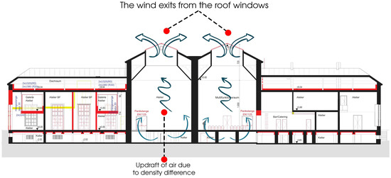The Praterateliers are recognized for their architectural and cultural significance under heritage regulations. As the last remaining structures from the 1873 World Exhibition, they symbolize an important aspect of Vienna’s cultural and architectural history [38]. Their preservation is crucial, reflecting Vienna’s architectural prowess and cultural vibrancy. The Austrian Federal Ministry for Art, Culture, the Civil Service, and Sport [39] acknowledges the Praterateliers as significant heritage sites. The restoration, supported by approximately EUR 11 million from the EU Recovery and Resilience Plan, is part of the broader NextGenerationEU initiative. This restoration focuses on energy efficiency while adhering to heritage conservation principles, ensuring that the buildings’ historical integrity is maintained. The transformation of the Praterateliers into a modern center for contemporary art aims to foster cultural exchange and provide improved working spaces for artists while retaining the buildings’ historic charm. This ongoing project includes new event spaces and project-based ateliers to facilitate artistic collaboration and innovation [39]. Upon examination of the archival records and visual documentation, it becomes evident that the northern pavilion of the selected site underwent significant modifications, resulting in its division into two stories during various restoration processes. Conversely, the southern pavilion remains a single-story structure, thereby meeting the research requirement for an intact building suitable for investigation. As a result of this assessment, the southern pavilion has been identified as the ideal case study for this research endeavor. Its status as a one-story building ensures consistency with research objectives and facilitates a focused examination of wind-driven ventilation systems. Given their historical and architectural significance, preservation efforts for the Praterateliers have focused on maintaining their structural integrity and aesthetic qualities. This involves addressing the challenges of aging materials, environmental exposure, and the need for modern amenities without compromising the buildings’ historic character.