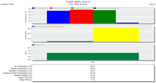 Air temperature and PMV for zone 12—without any natural ventilation methods—run period, shown in the DesignBuilder software.