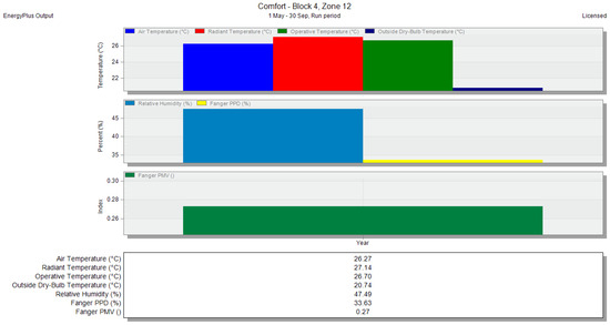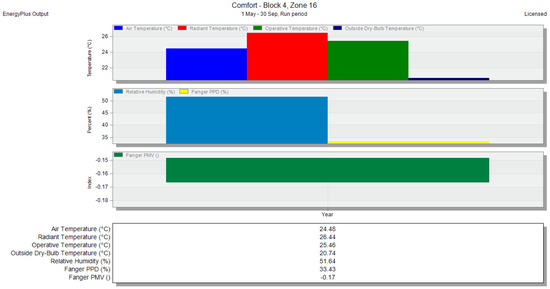 - Operative temperature: this is the mean of the air temperature and radiant temperature within the evaluated internal space (zone), representing the overall thermal environment [42].