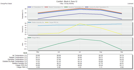 Air temperature and PMV for zone 12—without any natural ventilation methods—monthly period, shown in the DesignBuilder software.