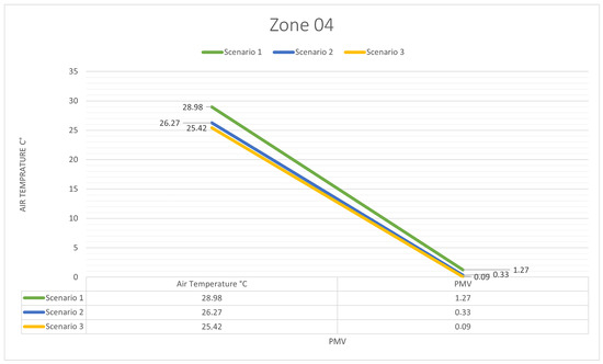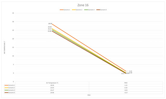 The results analysis for each applied scenario, based on the air temperature and PMV in zone 16.