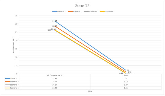 The results analysis for the applied Scenarios 1, 2, 4, and 5, based on the air temperature and PMV in zone 12.