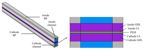 Figure 1 presents a typical single-channel model of the PEM EL, representing the fundamental unit of the flow field. The physical domain includes the bipolar plate, flow channel, gas diffusion layer (GDL), catalyst layer (CL), and PEM (Nafion112, 50 μm). On the anode side, the flow channel is supplied with a pure water inlet and an outlet for the gas–liquid mixture. In contrast, the cathode side does not have a direct water supply; however, water can permeate from the anode to the cathode through the proton exchange membrane during the electrolysis process. As a result, the cathode channel includes only an outlet for the gas–liquid mixture. The anode and cathode channels are symmetric.