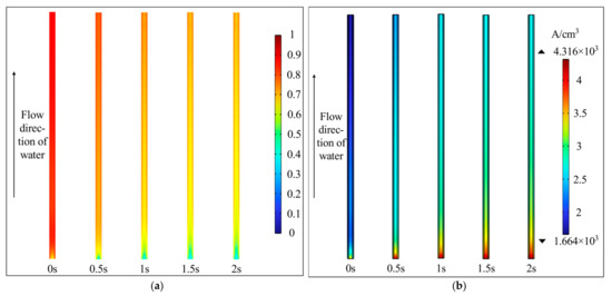 Under a 2 V voltage input, the dynamic process of increasing the water pump flow rate from 3 to 20 mL·min−1 over 2 s was simulated. As shown in Figure 3a, the oxygen volume fraction in the anode CL decreases gradually with increasing flow rate, stabilizing after approximately 1.5 s. Figure 3b illustrates that the volumetric current density in the CL increases with higher water flow rates (and reduced oxygen fraction) as the enhanced flow facilitates the expulsion of oxygen bubbles, thereby reducing mass transfer losses.